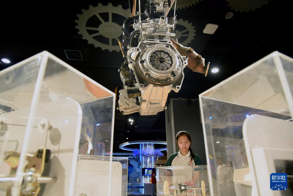 7月7日,一名中學(xué)生在山東省棗莊市科技館了解內(nèi)燃機(jī)工作原理。