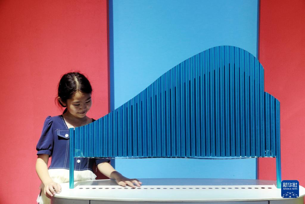 7月7日,在山東濰坊高密市科技館,一名小朋友在體驗(yàn)音樂(lè)科普設(shè)備。