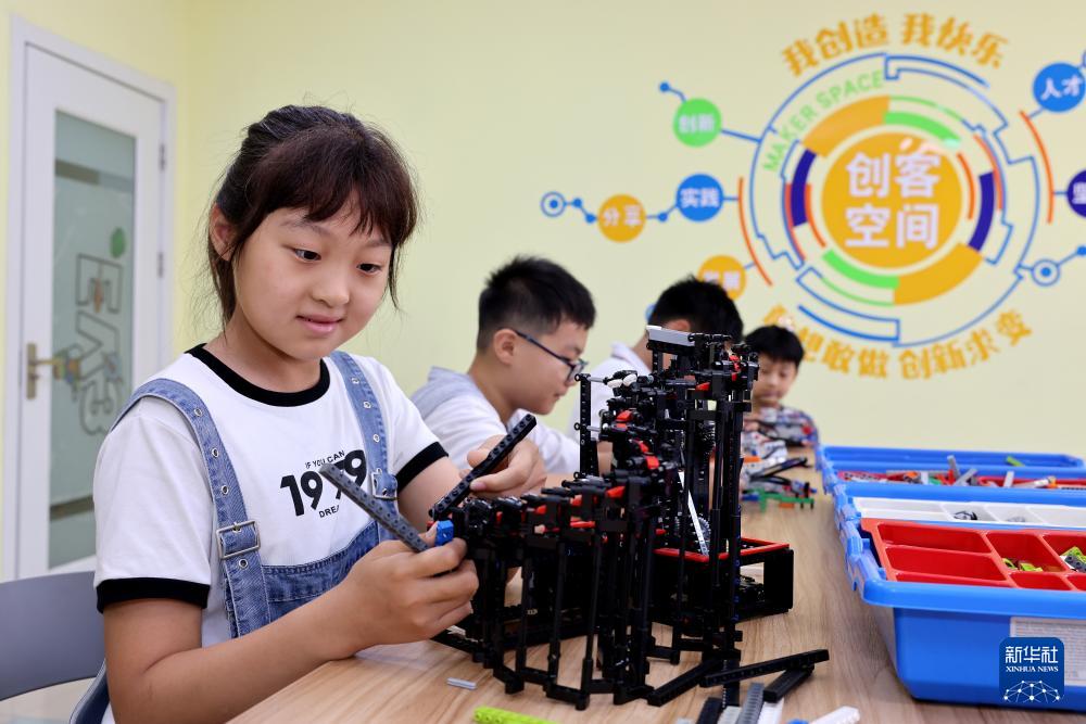 7月7日,學(xué)生在山東省棗莊市科普基地學(xué)習(xí)組裝機(jī)器人。