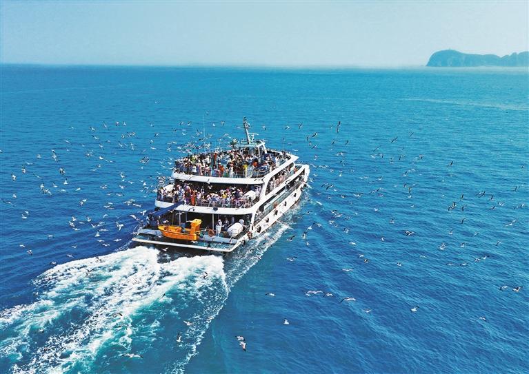 7月10日,山東榮成市海驢島景區(qū)迎來觀鷗旅游熱潮,游客乘游艇觀海鷗、賞海景。當(dāng)?shù)亻_通環(huán)島游專線,讓游客感受海風(fēng)清涼。