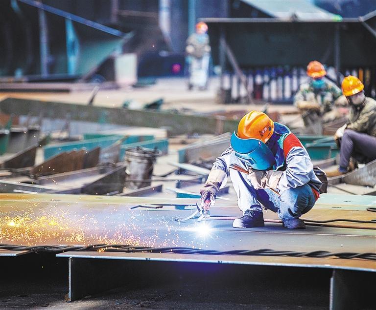 7月8日,江蘇南通市通州區(qū),南通象嶼海洋裝備有限責(zé)任公司員工在趕制出口船舶訂單。江蘇省是全國船舶海工產(chǎn)業(yè)第一大省,各類船舶出口規(guī)模連續(xù)多年居全國首位。