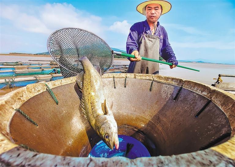 7月11日,浙江溫嶺市塢根鎮(zhèn)鱸魚養(yǎng)殖戶在收獲鱸魚。該鎮(zhèn)主要養(yǎng)殖鱸魚、紫菜、海帶、牡蠣等水產(chǎn)品,養(yǎng)殖面積18800畝,年銷售額超1億元。