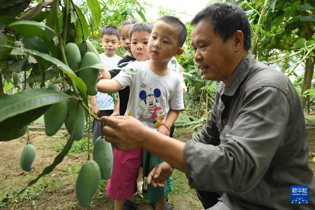 8月28日,在諸暨市浬浦鎮(zhèn),返鄉(xiāng)創(chuàng)業(yè)的種植戶姚雪鋒在熱帶水果園內(nèi)給參加研學(xué)的小學(xué)生介紹水果知識(shí)。