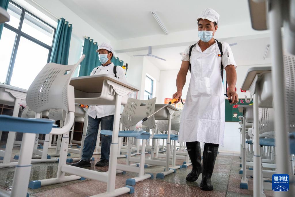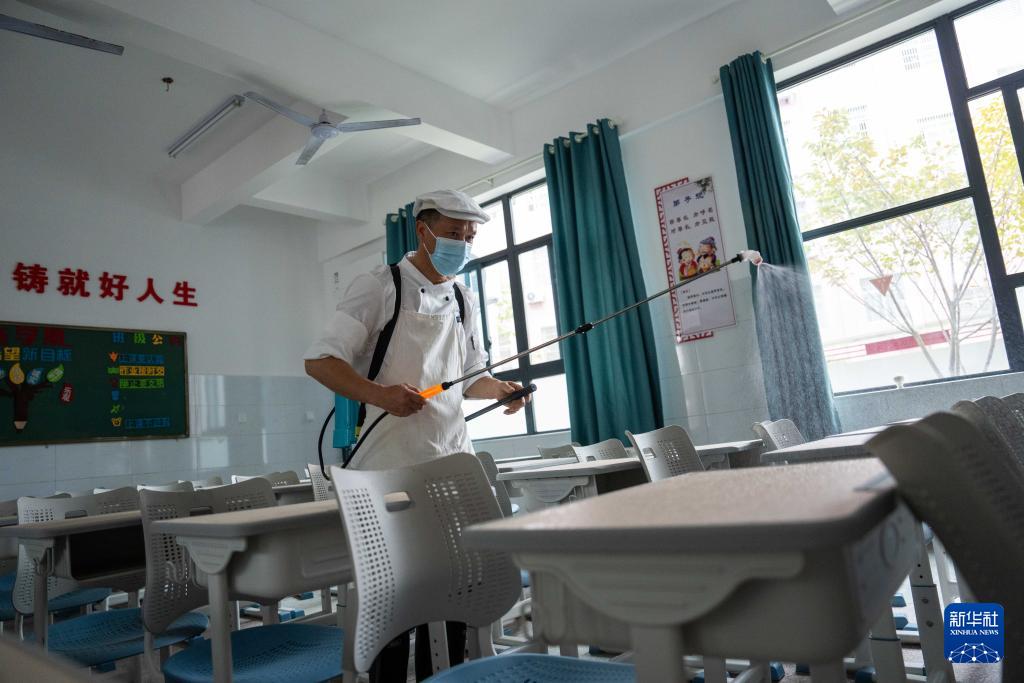8月29日,在平江縣啟明中學(xué),學(xué)校職工在教室進行消殺防疫作業(yè)。
