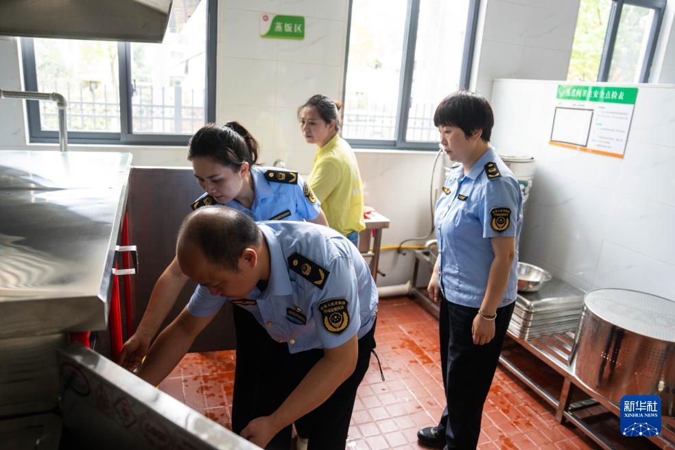 8月29日,在平江縣啟明中學(xué),市場監(jiān)督管理局工作人員對重裝過的食堂進行食品衛(wèi)生安全檢查。