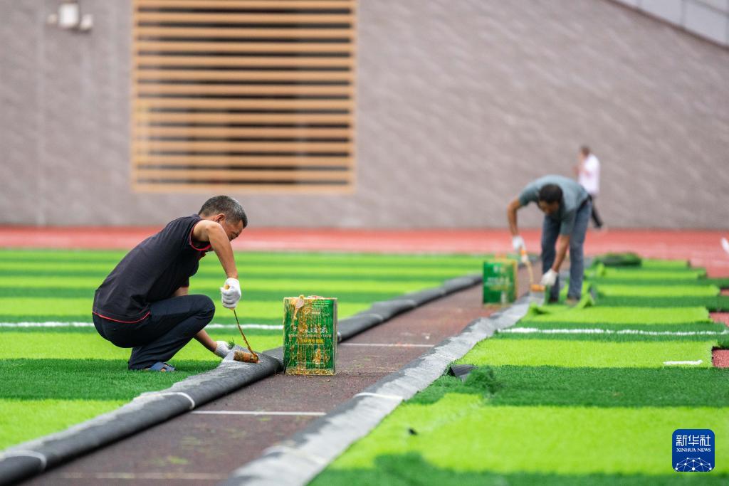 8月29日,在平江縣桂花學(xué)校,施工人員對操場的人造草坪進行修復(fù)。