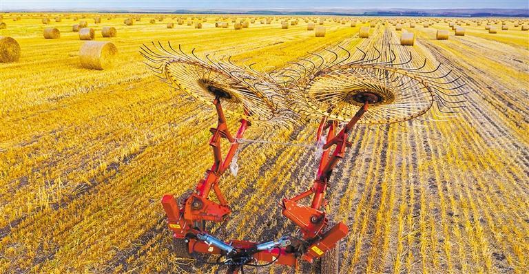 8月28日,新疆維吾爾自治區(qū)昭蘇縣小麥?zhǔn)崭詈螅悄軗Р輽C(jī)在田間作業(yè)。秦 杰攝(中經(jīng)視覺)