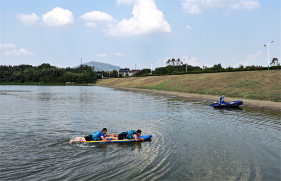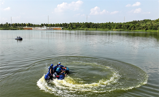 2024年8月31日,在安徽省合肥市廬江縣廬城鎮(zhèn)余月水庫(kù),當(dāng)?shù)氐乃{(lán)天救援隊(duì)隊(duì)員正冒著“秋老虎”的38°高溫,強(qiáng)化訓(xùn)練,提升救援隊(duì)綜合技能,打造一支專業(yè)的救援隊(duì)伍,時(shí)刻準(zhǔn)備搶險(xiǎn)救援。(巢志斌 攝)