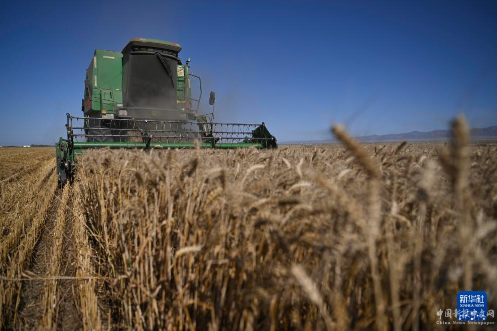 9月7日,農(nóng)戶駕駛收割機在新疆生產(chǎn)建設(shè)兵團第十三師新星市紅山農(nóng)場收割小麥。