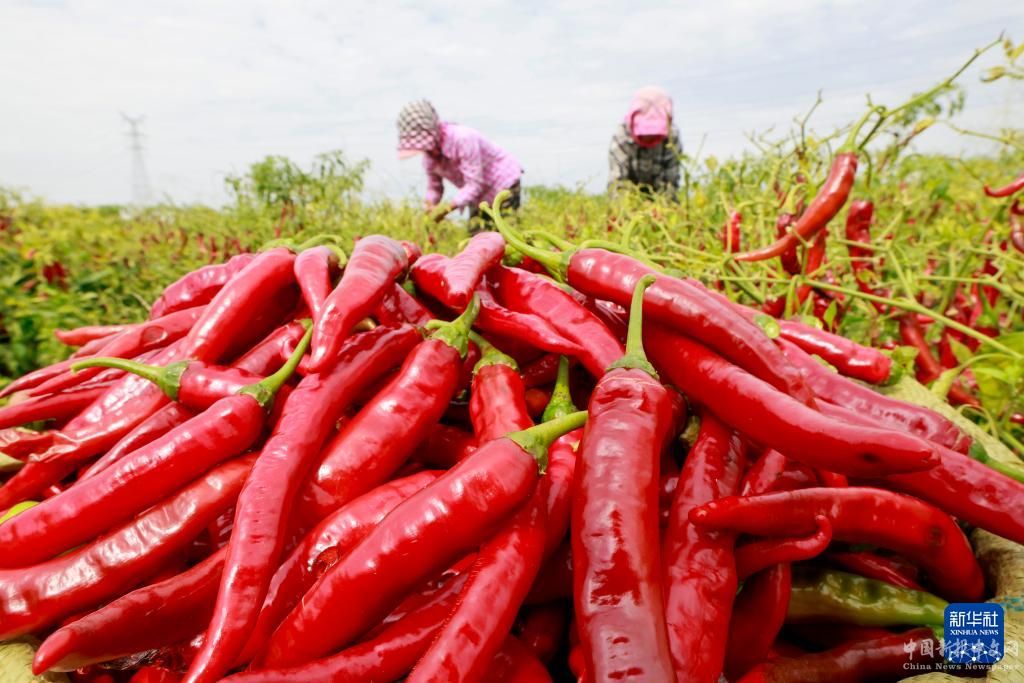 9月7日,河北省唐山市豐南區(qū)岔河鎮(zhèn)楊義口頭三村農(nóng)民在田間采摘辣椒。