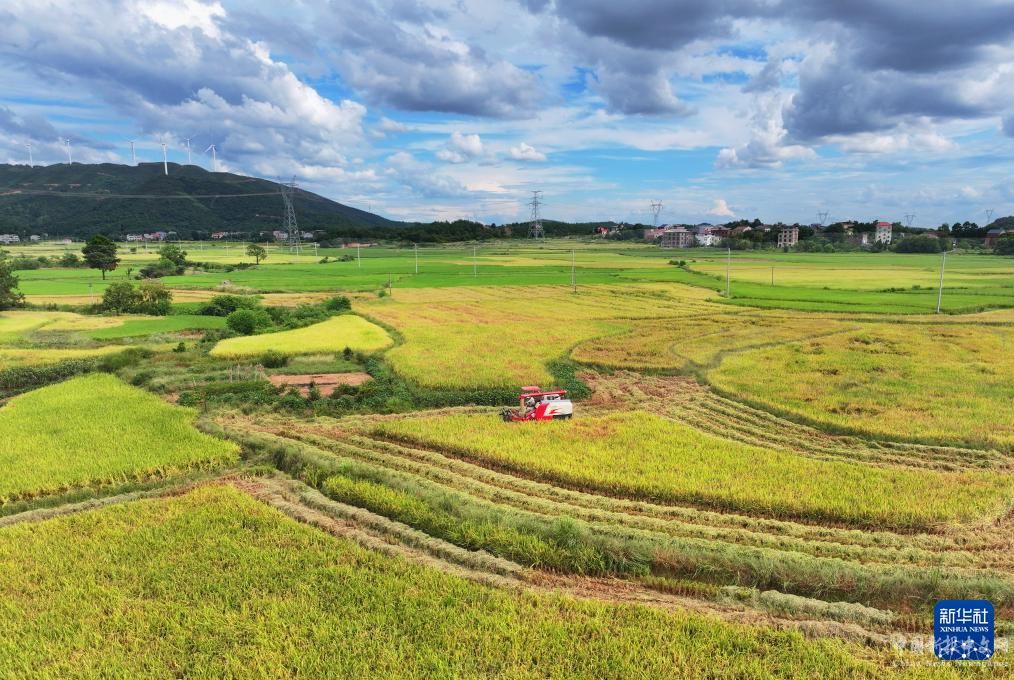 9月7日,在湖南省衡陽(yáng)市衡東縣石灘鄉(xiāng),當(dāng)?shù)卮迕耨{駛農(nóng)機(jī)在收割稻谷(無(wú)人機(jī)照片)。