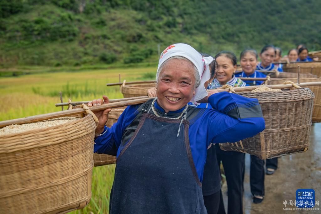 9月7日,在云南省文山壯族苗族自治州廣南縣八寶鎮(zhèn)坡現(xiàn)村,村民用籮筐把打好的稻谷挑回家。