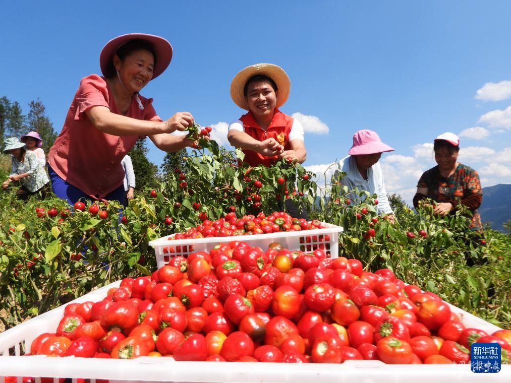 9月7日,在四川省達(dá)州市萬(wàn)源市大竹鎮(zhèn)土埡子村,駐村工作隊(duì)員和村民加緊采摘珠子椒。