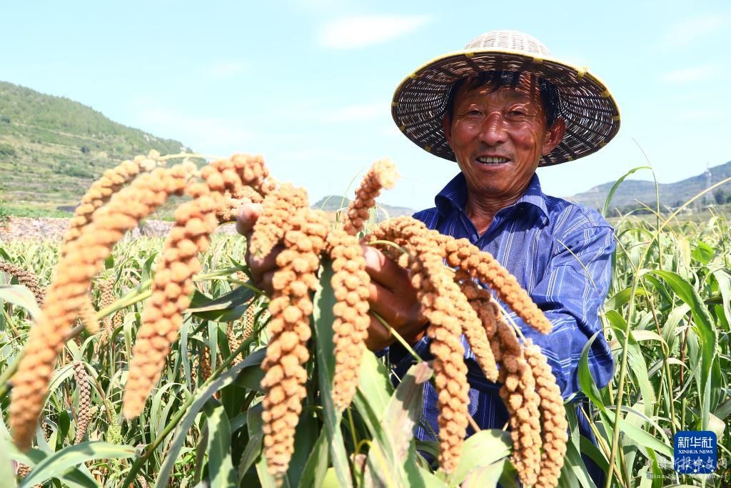 9月7日,山東省棗莊市山亭區(qū)山城街道農(nóng)民在展示收獲的谷子。