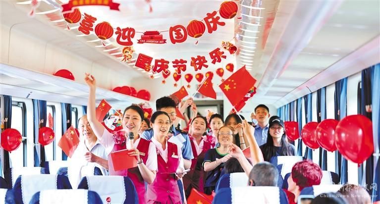 ?、?月30日,福州開往松溪的K8746次列車上,福州客運段福京車隊乘務(wù)員與旅客同聲合唱《我和我的祖國》。王旺旺攝(中經(jīng)視覺)