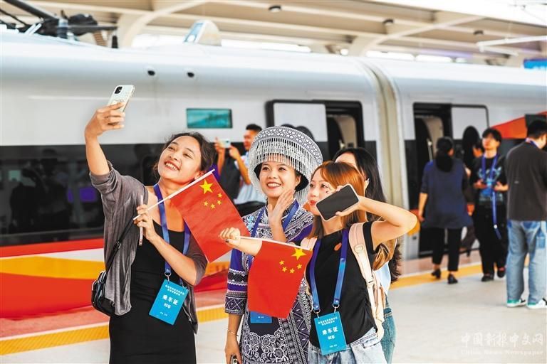 ?、?月29日,渝昆高鐵川渝段(重慶西至四川省宜賓站)開通運營,旅客手持國旗在站臺上留影。莊歌爾攝(中經(jīng)視覺)