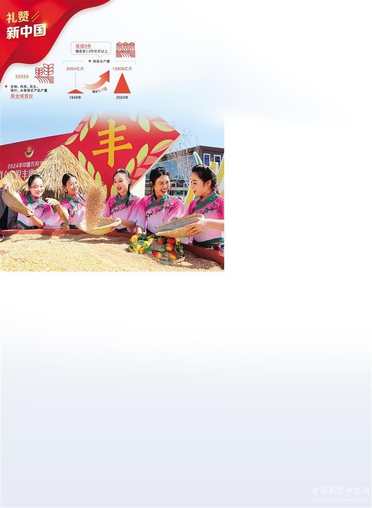 豐收的田野是最美的畫卷。從“5億人吃不飽”到“14億多人吃得好”,新中國成立75年來,我國農(nóng)業(yè)發(fā)展呈現(xiàn)翻天覆地的變化,實現(xiàn)了舉世矚目的發(fā)展,中國人把飯碗牢牢端在了自己手中。我國糧食總產(chǎn)量由1949年的2264億斤增加到2023年的13908億斤,增長5.1倍;2023年人均糧食產(chǎn)量493公斤,不僅超出世界平均水平,也高于國際公認的400公斤糧食安全線。黨的十八大以來,我國糧食連續(xù)9年穩(wěn)定在1.3萬億斤以上。豐收的喜悅里,有泥土味兒,也有科技范兒;有供給充足,也有質(zhì)優(yōu)價穩(wěn);有結(jié)構(gòu)調(diào)優(yōu),也有動能向綠。強國必先強農(nóng),農(nóng)強方能國強。新征程上,我們正奮力譜寫更加壯麗的“三農(nóng)”新篇章。(來源:經(jīng)濟日報)