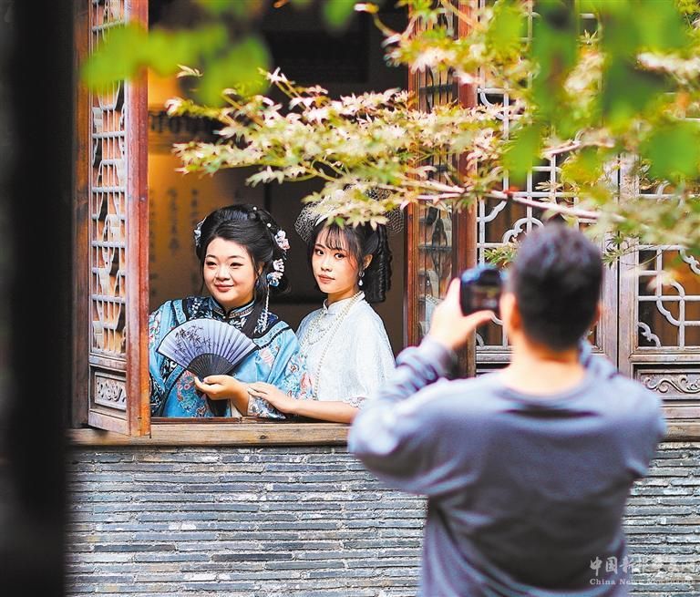 10月6日,游客在江蘇省南京市老門(mén)東景區(qū)體驗(yàn)旅拍。蘇 陽(yáng)攝(中經(jīng)視覺(jué))