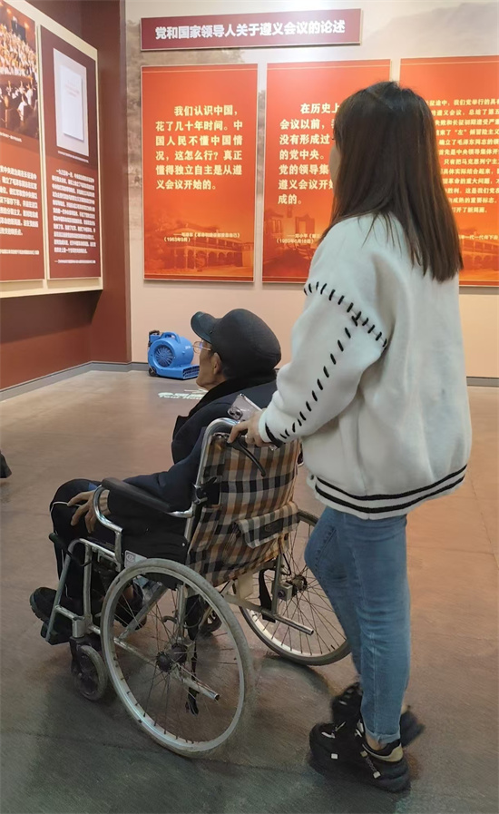 10月17日,有游友在遵義會議會址展廳參觀時,發(fā)現(xiàn)了暖心的一幕,來自桐梓的王女士推著年邁的外公參觀展館,并不時俯身向老人介紹內(nèi)容。