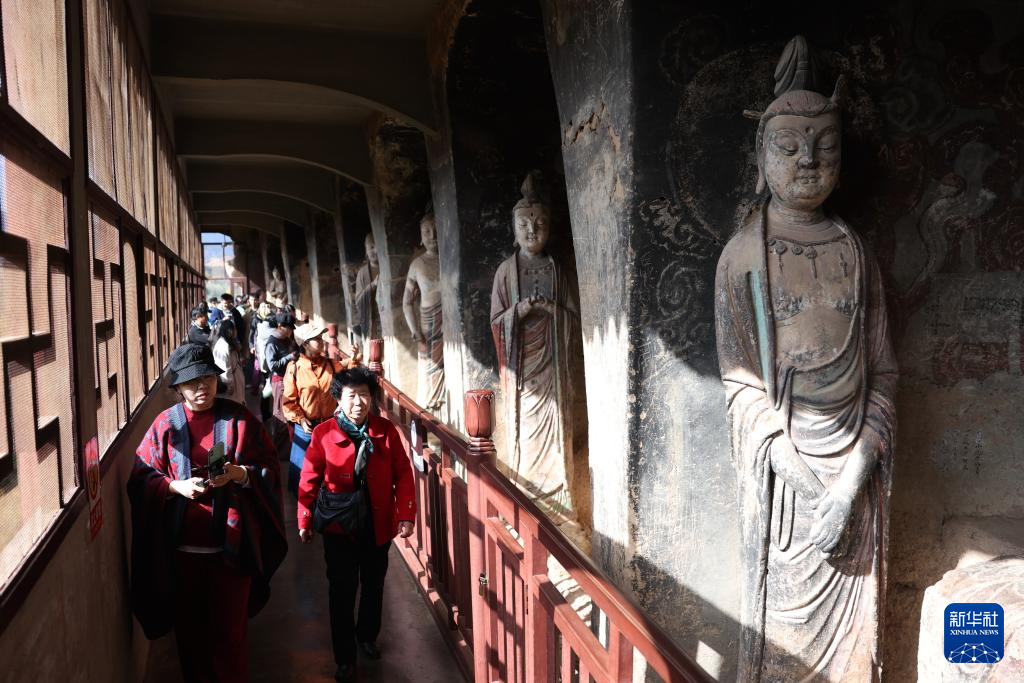 11月2日,游客在麥積山石窟參觀游覽時用手機拍攝開放洞窟彩塑。