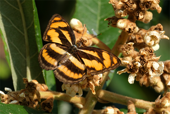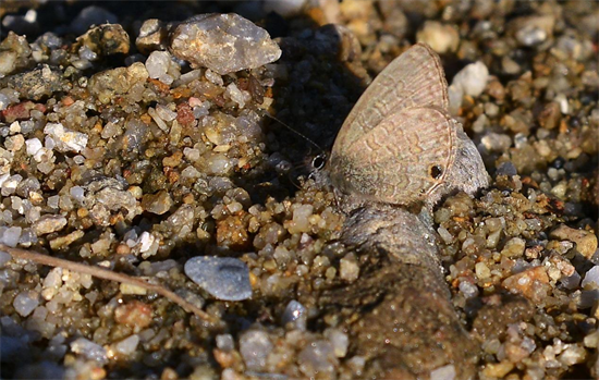 眼下雖是立冬前后,在天寶巖保護區(qū),卻常有晴好天氣,開花的枇杷樹、溫暖潮濕的溪澗沙灘,經(jīng)常吸引相思帶蛺蝶、娜拉波灰蝶等蝴蝶紛至沓來。此次監(jiān)測到的相思帶蛺蝶為漂亮的雌蝶,翅背面褐色,斑紋為橙黃色,前翅中室斑有鋸齒紋。一年多代,成蟲多見于5月至11月。娜拉波灰蝶系小型灰蝶,腹面擁有多組兩側(cè)鑲白線的暗紋列,后翅具絲狀尾突,后翅近臀角呈黑色鑲橙邊眼紋,外側(cè)自帶金屬藍色鱗片。