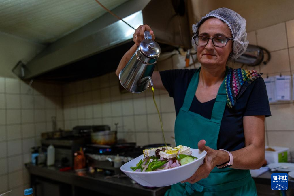 11月3日,在希臘伯羅奔尼撒半島麥西尼亞,一名女子向沙拉上倒橄欖油。