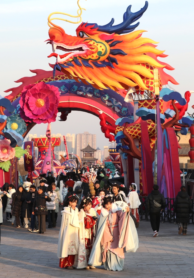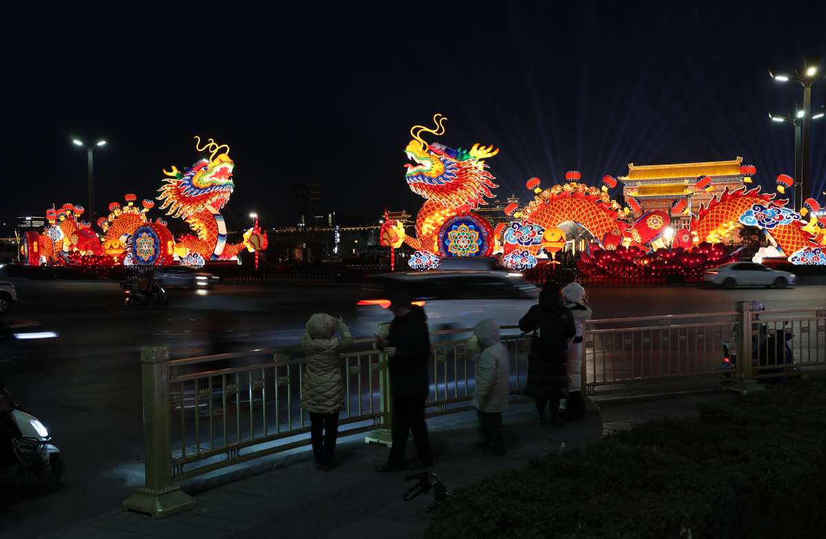 2024年1月24日,西安永寧門廣場,兩條彩色巨龍花燈吸引了許多市民和游客拍照打卡。中國日報記者 鄒紅 攝