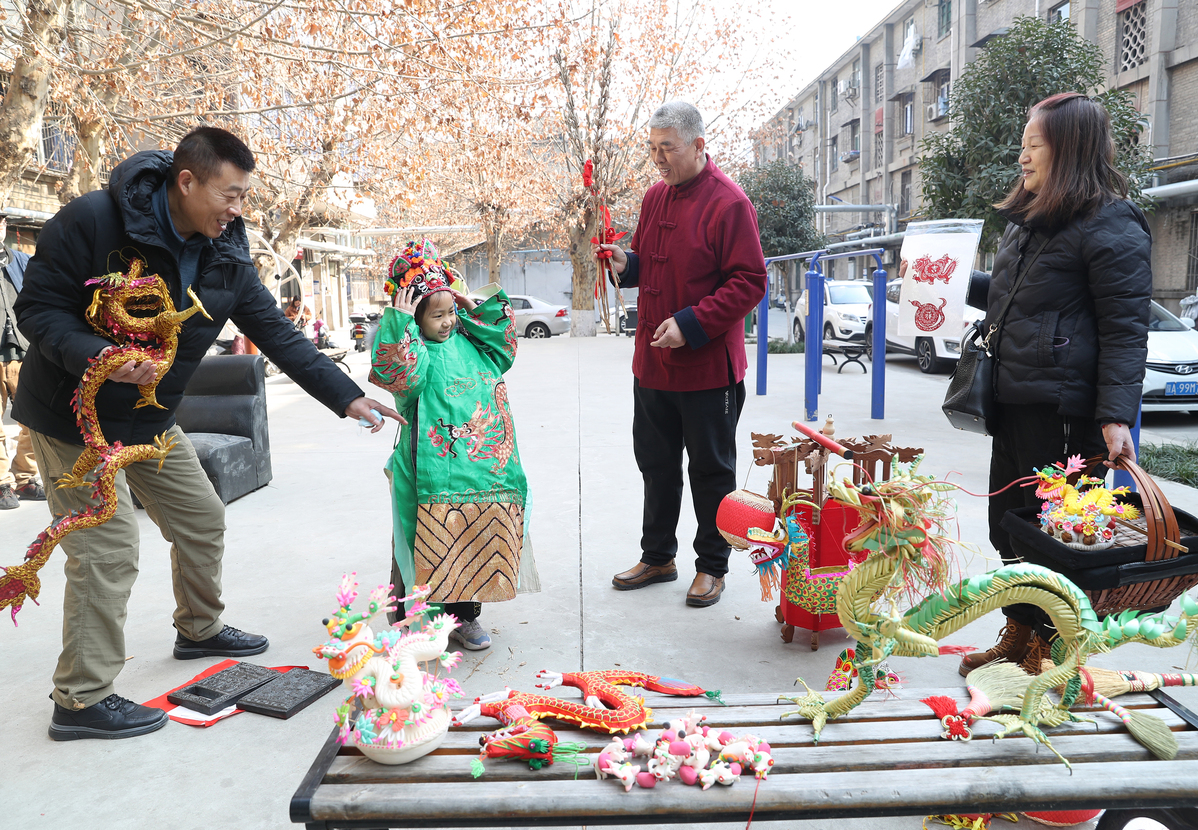 2024年1月26日,陜西民俗專家、西安非遺推廣大使王智老師(右二)通過實物為市民解讀龍文化背后所蘊藏著的精神內(nèi)涵。中國日報記者 鄒紅 攝