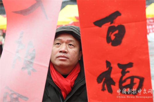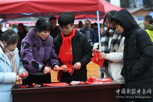 2024年2月2日,貴州省凱里市2024年送春聯(lián)、拍全家?;顒?dòng)走進(jìn)凱里苗侗風(fēng)情園,市民在挑選春聯(lián)。(楊仁海 攝)