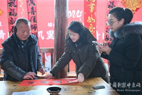 2024年2月2日,貴州省凱里市2024年送春聯(lián)、拍全家福活動(dòng)走進(jìn)凱里苗侗風(fēng)情園,書法家(左一)在義務(wù)給市民書寫春聯(lián)。(楊仁海 攝)