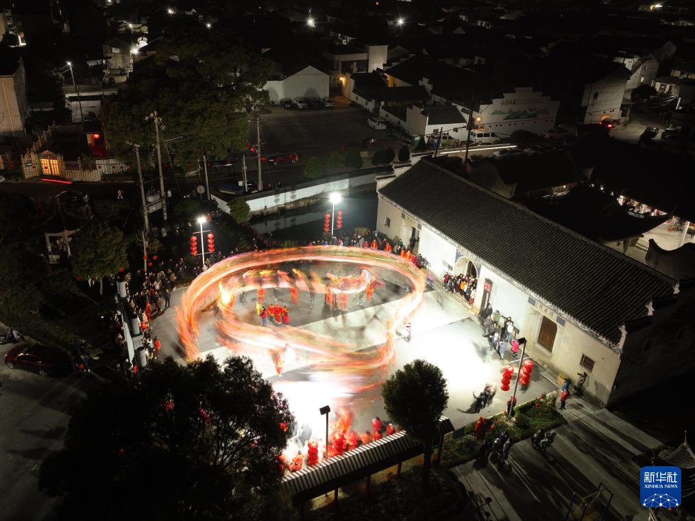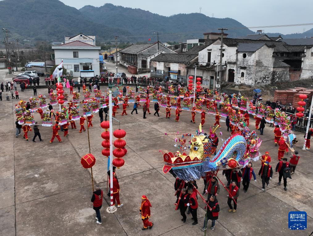2月5日,舞龍隊在豐江周村一處廣場表演(無人機(jī)照片)。