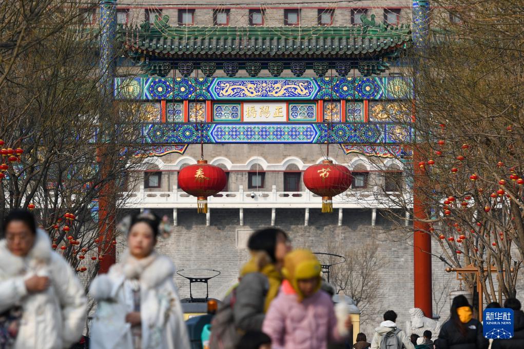 游客在前門大街參觀游覽,前門五牌樓上裝飾有龍紋(2月5日攝)。