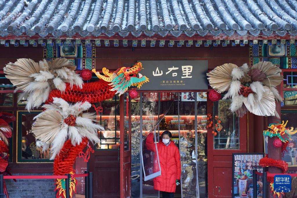 這是在景山公園里一處文創(chuàng)咖啡店拍攝的龍形象節(jié)日裝飾物(1月23日攝)。