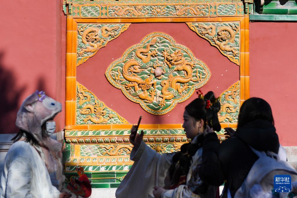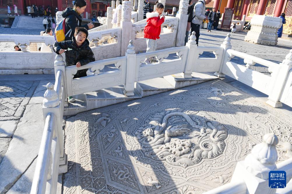 游客在天壇公園參觀游覽,天壇公園欄桿上雕刻有龍的形象(1月23日攝)。
