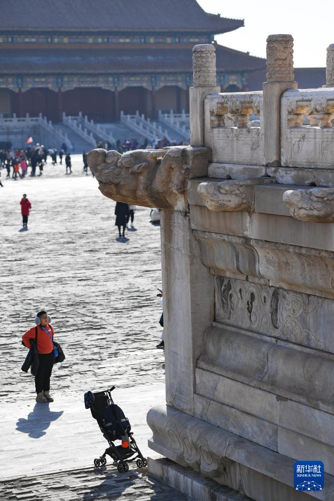 這是故宮皇極殿前雕有龍的御路石(1月28日攝)。