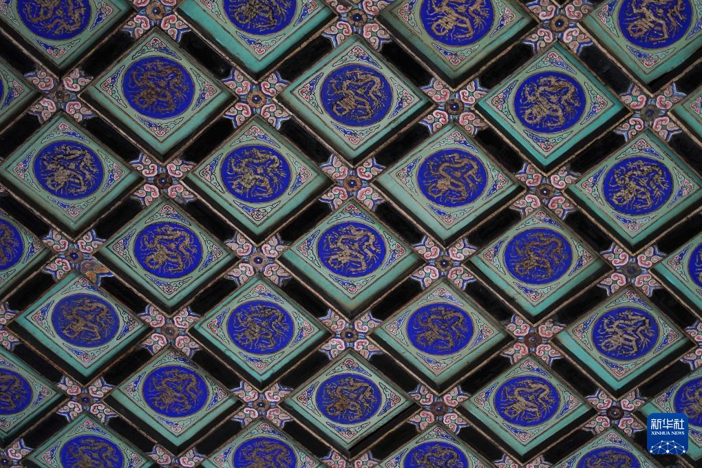 這是北京國子監(jiān)辟雍殿內(nèi)拍攝的團(tuán)龍合璽井口式天花(1月21日攝)。北京國子監(jiān)位于北京中軸線緩沖區(qū)內(nèi)。