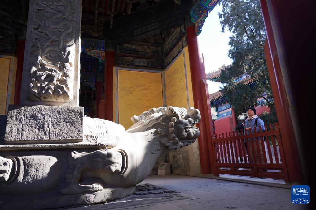 這是景山壽皇殿院內(nèi)一座古建屋頂局部,最右側(cè)的脊獸是神話傳說中龍生的九子之一“嘲風(fēng)”(1月23日攝)。