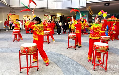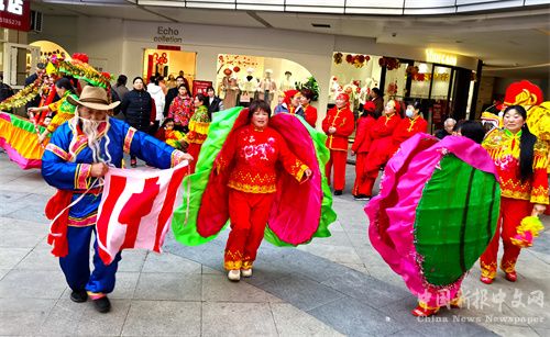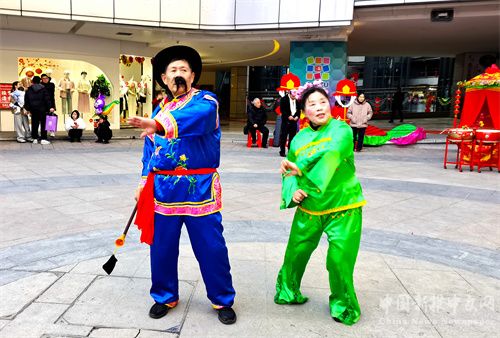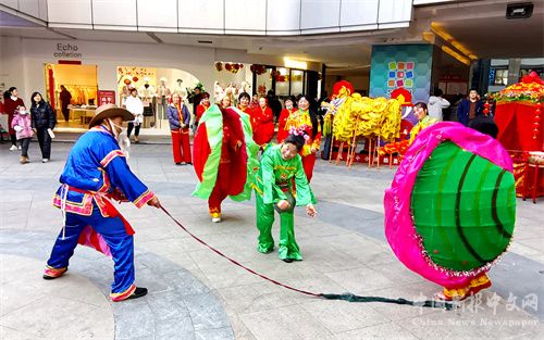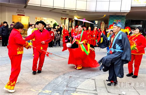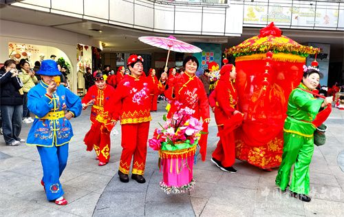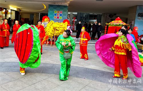 2024年2月12日,正月初三,安徽省合肥市廬江縣白山鎮(zhèn)姐妹花藝術(shù)團(tuán)來(lái)到縣城商業(yè)綜合體安德利廣場(chǎng),表演旱地行舟、河蚌舞、挑花挑、花式鑼鼓、抬大花轎、花鼔唱等民俗節(jié)目,吸引了許多市民前來(lái)欣賞演出,感受民俗營(yíng)造的濃濃“年味”。 (巢志斌 攝)