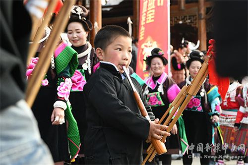 2024年3月2日,在貴州省凱里市舟溪鎮(zhèn),一名苗族男孩在吹奏蘆笙。(楊仁海 攝)