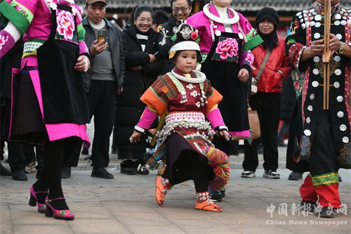 2024年3月2日,在貴州省凱里市舟溪鎮(zhèn),一名苗族女孩在跳蘆笙舞。(楊仁海 攝)