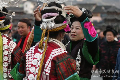 2024年3月2日,在貴州省凱里市舟溪鎮(zhèn),苗族母親在給女兒整理銀帽。(楊仁海 攝)