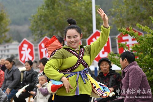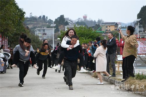 3月8日,貴州省凱里市下司鎮(zhèn)馬場(chǎng)村,村民在背媳婦跑步比賽。(楊仁海 攝)