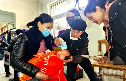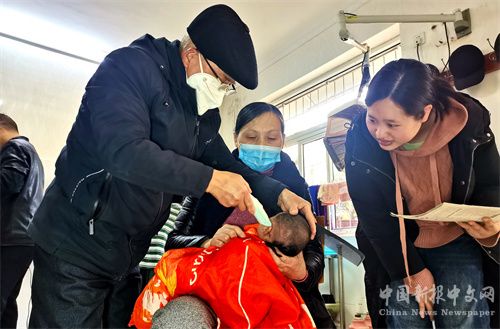 2024年3月11日,農(nóng)歷二月初二,安徽省合肥市廬江縣廬城鎮(zhèn)工行巷父子理發(fā)店,理發(fā)師朱和生和女兒朱曉倩、女婿汪崤晨忙著為嬰兒剃胎毛。