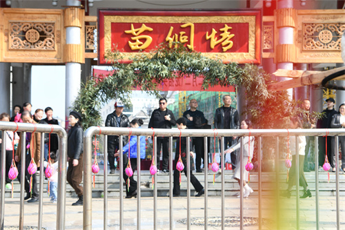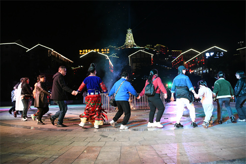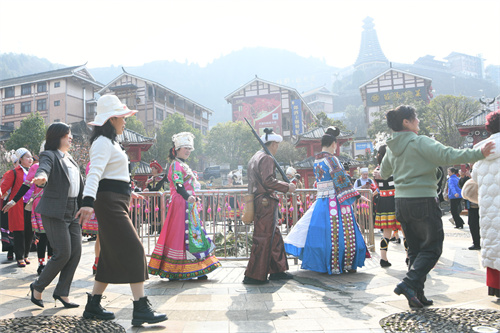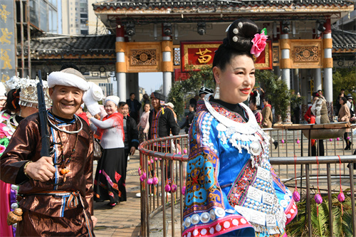 3月11日,貴州省凱里市凱解放大路房侗風情園,游客們在跳蘆笙舞。(楊仁海 攝)