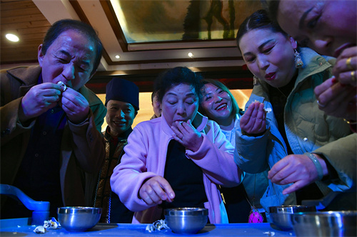 3月11日,貴州省凱里市凱里侗風情園,參賽選手們在吃鵪鶉蛋比賽。(楊仁海 攝)