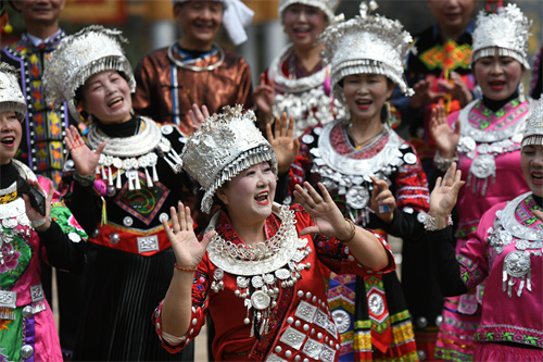 3月11日,貴州省凱里市凱里侗風情園,當?shù)厣贁?shù)民族群眾在表演歌舞。(楊仁海 攝)