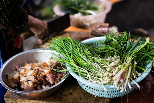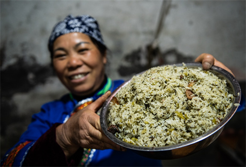跟著秦蘭生走進她的廚房,一排灶,三口鍋,一個甑子,幾個侗家婦女在幫忙燒火、切菜、炒菜。把蒸熟的米飯舀起倒在簸箕里,摻著炒熟的臘肉、蒿菜、青菜、野蔥,攪拌均勻后再次上甑,又蒸一次。陣陣香味迎面撲來……