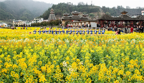 天柱縣注溪鄉(xiāng)社節(jié)當(dāng)天游客在花海游玩。