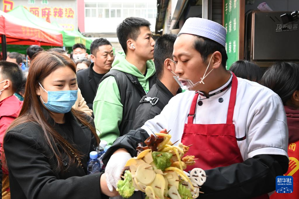 3月16日,在天水市秦州區(qū)的天水名優(yōu)小吃城,游客挑選好麻辣燙菜品后排隊等待加工。