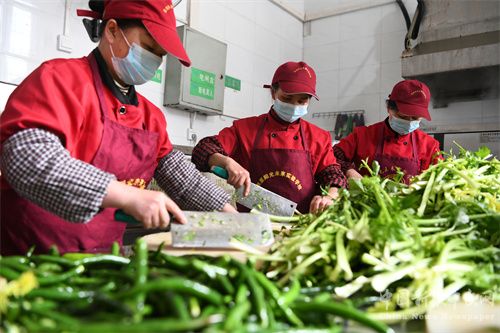 2024年3月19日,貴州省凱里市凱里陽光未來實驗學校,廚師們在切菜。(楊仁海 攝)